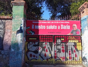 Finché ha potuto Dario ha partecipato alle riunioni in solidarietà con la Palestina, la sua ultima manifestazione è stata quella a piazzale Ostiense dove ha potuto partecipare solo grazie alla sedia a rotelle.  In qualche modo sono felice che non abbia assistito alla farsa di questa Pax americana imposta da un presidente che vuole trasformare Gaza in un resort gestito dal genero Jared Kushner. La bandiera palestinese sul manifesto per la commemorazione di Dario non è un caso, ma riflette il suo rispetto per quel popolo, e la sua opposizione al sionismo.